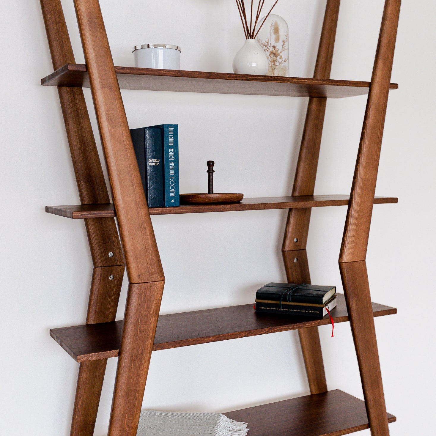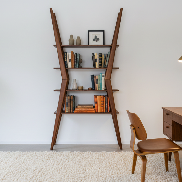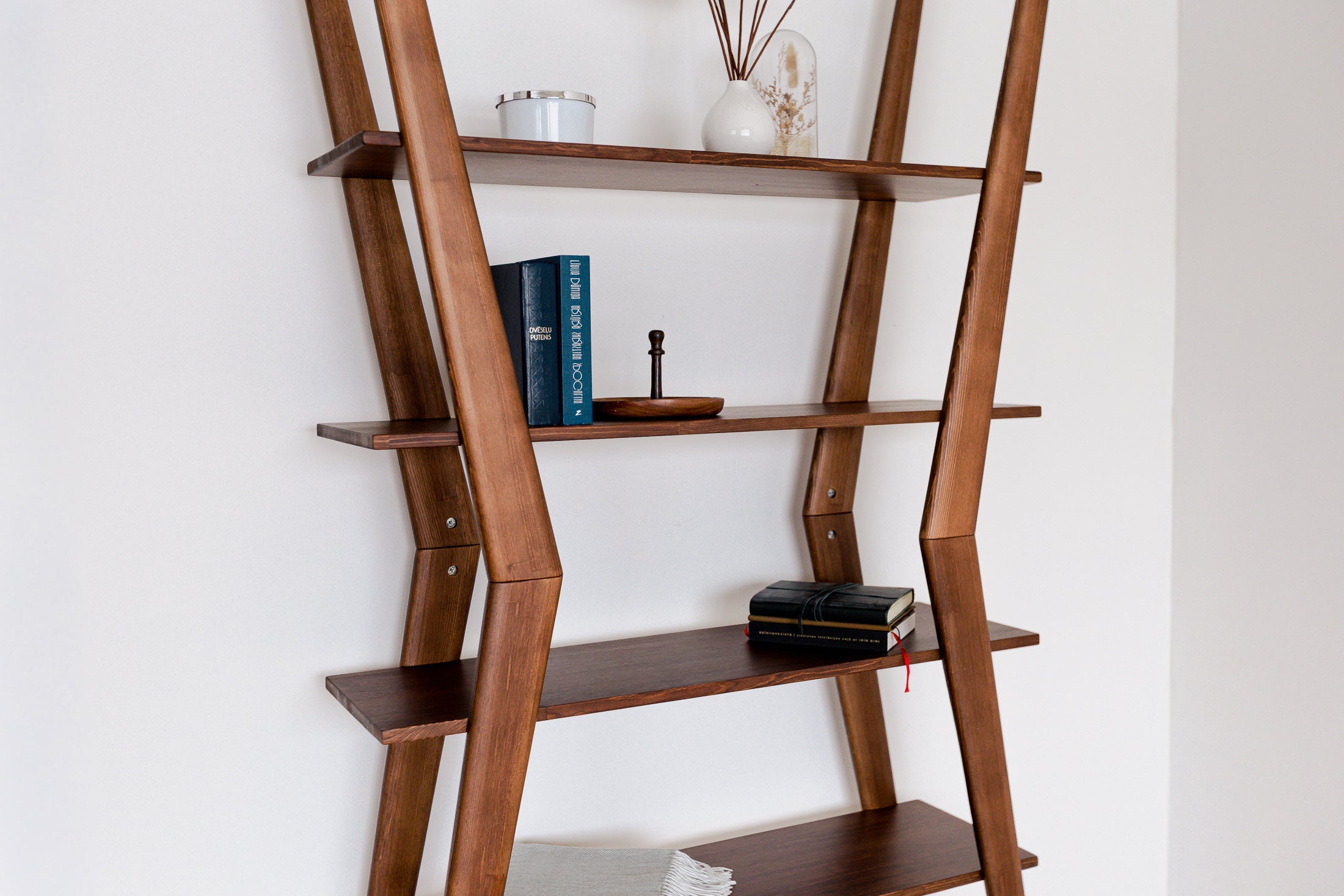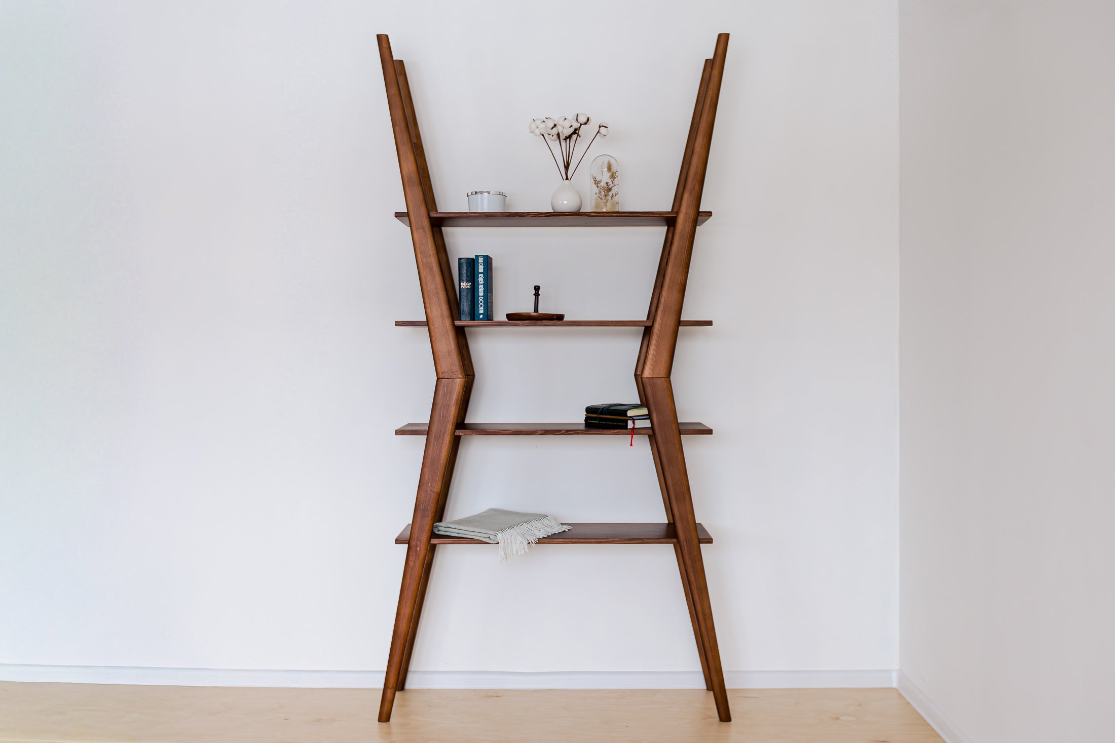 Verleihen Sie Ihrem Zuhause zeitloses Design mit diesem handgefertigten Regal im Mid-Century-Modern-Stil. Gefertigt aus hochwertigem Holz und in warmen, natürlichen Farbtönen gehalten, ist dieses Regal sowohl stilvoll als auch funktional. Seine klaren Linien und die geometrische Form machen es zum perfekten Blickfang für Wohnzimmer, Büro, Essbereich oder Eingangsbereich.